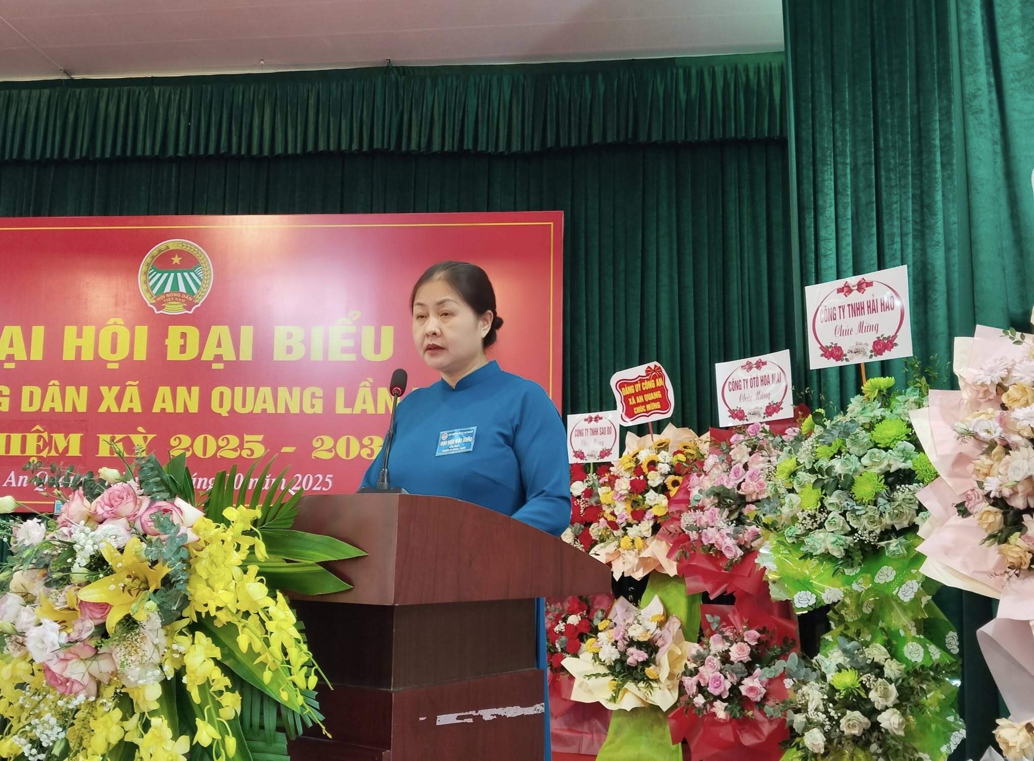 Phát biểu chỉ đạo tại Đại hội, đồng chí Đào Xuân Anh – Phó Chủ tịch Hội Nông dân thành phố Hải Phòng và đồng chí Nguyễn Thị Nhung – Phó Bí thư Thường trực Đảng ủy xã An Quang đã ghi nhận, đánh giá cao và chúc mừng những kết quả Hội Nông dân xã đạt được trong thời gian qua. Đồng thời, các đồng chí cũng chỉ rõ một số tồn tại, hạn chế được nêu trong Báo cáo chính trị, yêu cầu Ban Chấp hành khóa mới nghiêm túc tiếp thu, tìm giải pháp khắc phục kịp thời; tiếp tục đổi mới nội dung, phương thức hoạt động, phát huy hơn nữa vai trò tổ chức đại diện của nông dân, là cầu nối gắn bó giữa nông dân với cấp ủy, chính quyền các cấp.